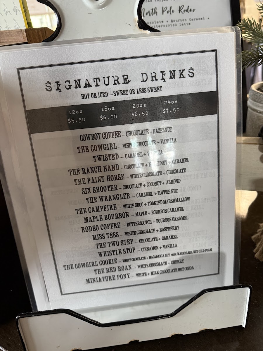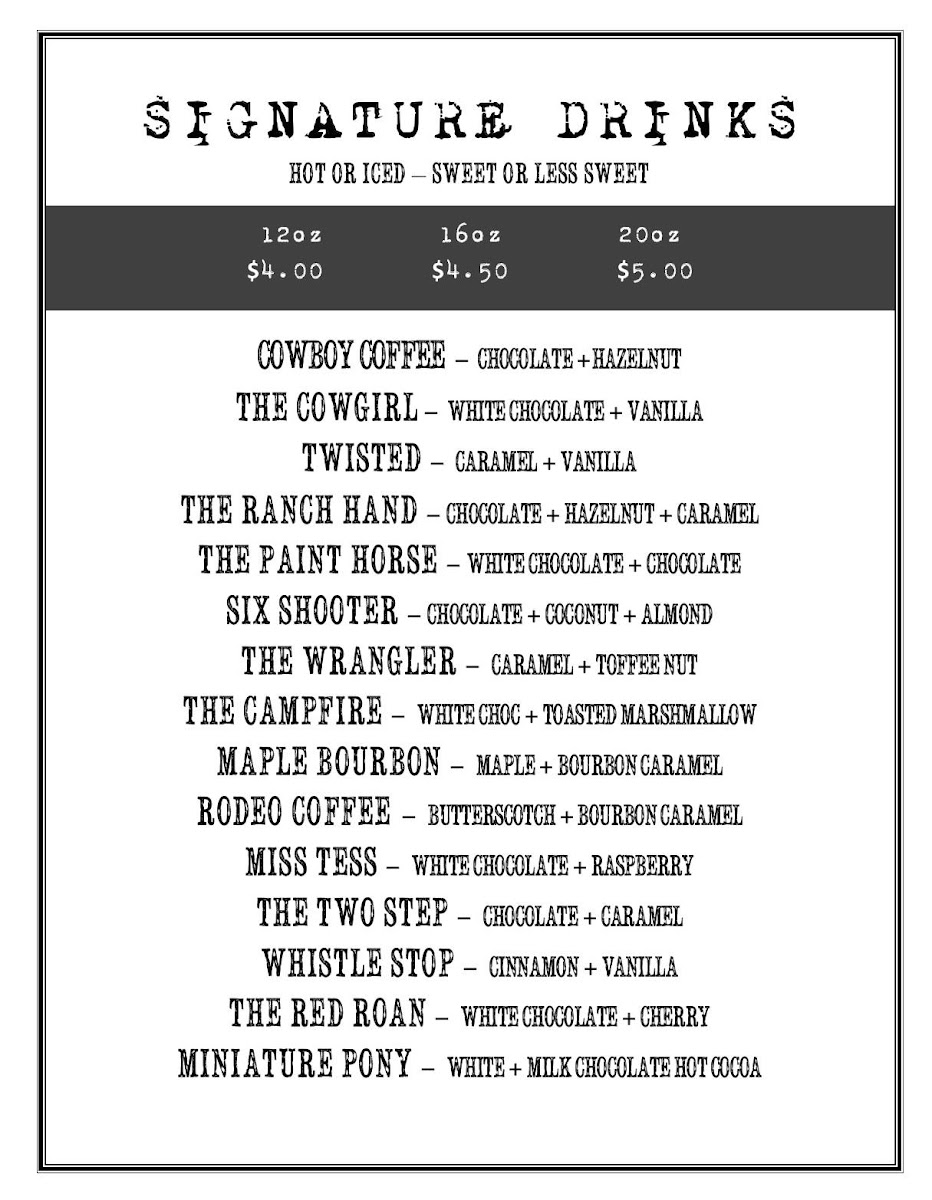 Additional specialty drinks and unique concoctions are found under the Others category. This includes items like Cowboy Coffee, The Cowgirl, Twisted, The Ranch Hand, The Paint Horse, Six Shooter, The Campfire, Miss Tess, The Two Step, Whistle Stop, The Cowgirl Cookie, The Red Roan, Miniature Pony, Cowboy Christmas, Frosted Pony, Jingle Juice, HoHo Cocoa, Butter Buckskin, Doc Holiday, The Wrangler, Maple Bourbon, Rodeo Coffee, and Cold Brew. These options offer a wide range of flavors and presentations for casual or social occasions.